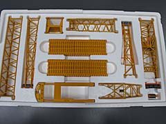 750t吊クレーンです。全高最大210cmです。ドイツのFranz Bracht仕様になります。 SDWBはメインブーム(Heavy)+デリックブームにラフィングフライジブとサスペンデッドバラストの構成です。 8軸のキャリアはステアリング可能、画像にはありませんがサイドミラーパーツも付属しています。 アウトリガーも展開できます。アウトリガーのシリンダーは内部にタップが切ってあるのでネジの溝が見えないよう工夫されています。 フックは2種類付属しています。ワイヤーの巻き取り動作により各部可動します。 シーブは樹脂製です。 H=210cm