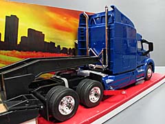 1/24スケール(全長約90cm)、ピータービルトのセミトラクター、低床セミトレーラーと積荷のクレーンのセットです。 トラクターの屋根のボタンを押すとライト点灯とサウンドギミックがあります。電池付きです。 トレーラーのグースネックは切り離せます。スロープが動きます。