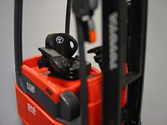 1/23スケール、トヨタの3輪フォークリフトです。後軸はステアリングします。フォークは上下します。パレット1枚付き。size=11.2x8.6x4.3cm