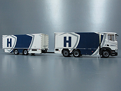 第2世代スカニアRシリーズ/ロールーフの6x2/4フルトラクターとセンターアクスルフルトレーラーを組み合わせた現金輸送車です。 シャーシはダイキャストですが架装とキャブの一部はレジンパーツになります。 トラクターの1軸目と3軸目はステアリング可能です。キャブチルトは出来ません。