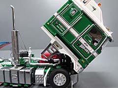 トラクターは右ハンドルでキャブチルト、ドアが開閉、ステアリング可能です。ドーリーは左右各2軸x4本タイヤのユニットが左右にスライドして車幅が変えられます。 トレーラーも左右が分割して積荷に合わせて車幅が変えられます。3軸x8本タイヤの構成です。 歩み板、ランディングギア、操作レバー等が可動。ミラーパーツ、スペアタイヤ、燃料タンク、実車のリーフレット付き。 Doolan's Heavy Haulage仕様で緑色/白色になります。
