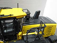 コマツのホイールローダーです。WA475の10型になります。 アーティキュレート動作可能、アームやバケットは上下に動かせます。アンテナが再現されています。L=約18cm
