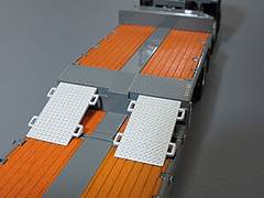 トレーラーは後ろ2軸がステアリングします。フロアは前後に伸縮します。 ランディングギアが伸縮します。サイドスタンションに取り付ける板、支柱パーツ、架台、スロープ(リア用とグースネック用)、車幅警告板、グースネックのアオリパーツ等が付属しています。 スイスのFRIDERICI仕様でグレー色になります。