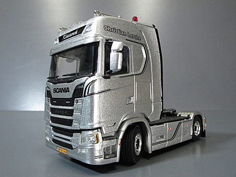 フロントはステアリング可能、キャブチルトも可能です。 エアホーン、回転灯、ルーフマーカー、メッキホイールパーツ等が取り付けられています。 デンマークの運送会社Christian Lerche仕様で色はメタリックシルバーになります。 実車がプリントされたシリアルナンバー(MAX 130)入りカードが付属しています。