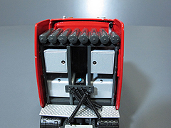 トレーラーはグースネック、2ビームフロアの構成になります。 トレーラーもステアリングが可能です。 フロアは前後に伸縮します。またサイドフラップを開いて付属の板を載せる事ができます。 その他、ピン類や車幅警告板等が付属しています。 赤のNooteboomカラーでオリジナルのパッケージデザインです。