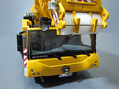 カウンターウェイトのベースプレートはジャッキが上下して、取付作業を再現できます。 またバラストのカップがスイングするバリオバラストの動作が可能です。 フックの巻き上げもできます。フックは3種類が付属しています。フックの左右に取り付けるフック用ウェイトも付属しています。 キャリアの折り畳み梯子が上下に動きます。旋回体上部の手すりは折り畳めます。 Yガイは起伏やV字状に開く事ができます。